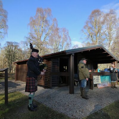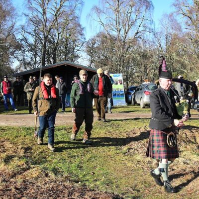 The piper then pipes our return to the hut as the hot sausage rolls and bread pudding are taken to ward off the chill wind of the morning.