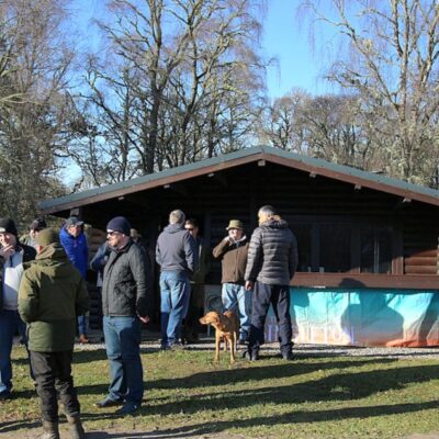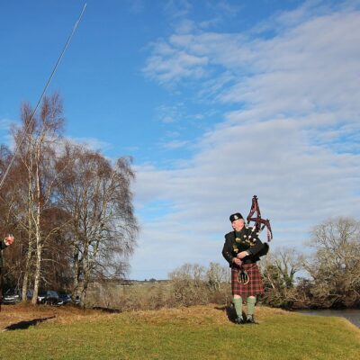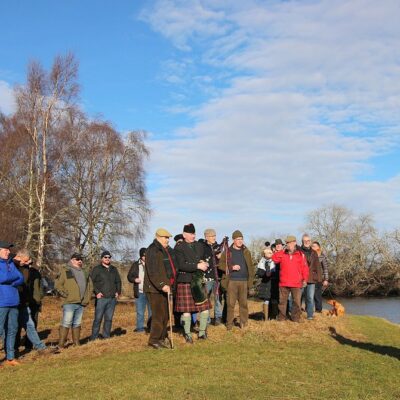 All gather at the fishing hut to await the piper leading us to the banks. A wonderful day considering the rest of Scotland’s weather situation.